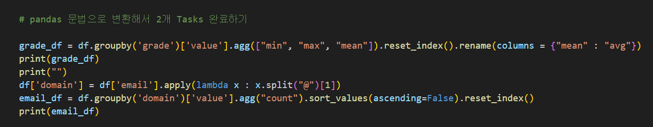 # pandas 문법으로 변환해서 2개 Tasks 완료하기