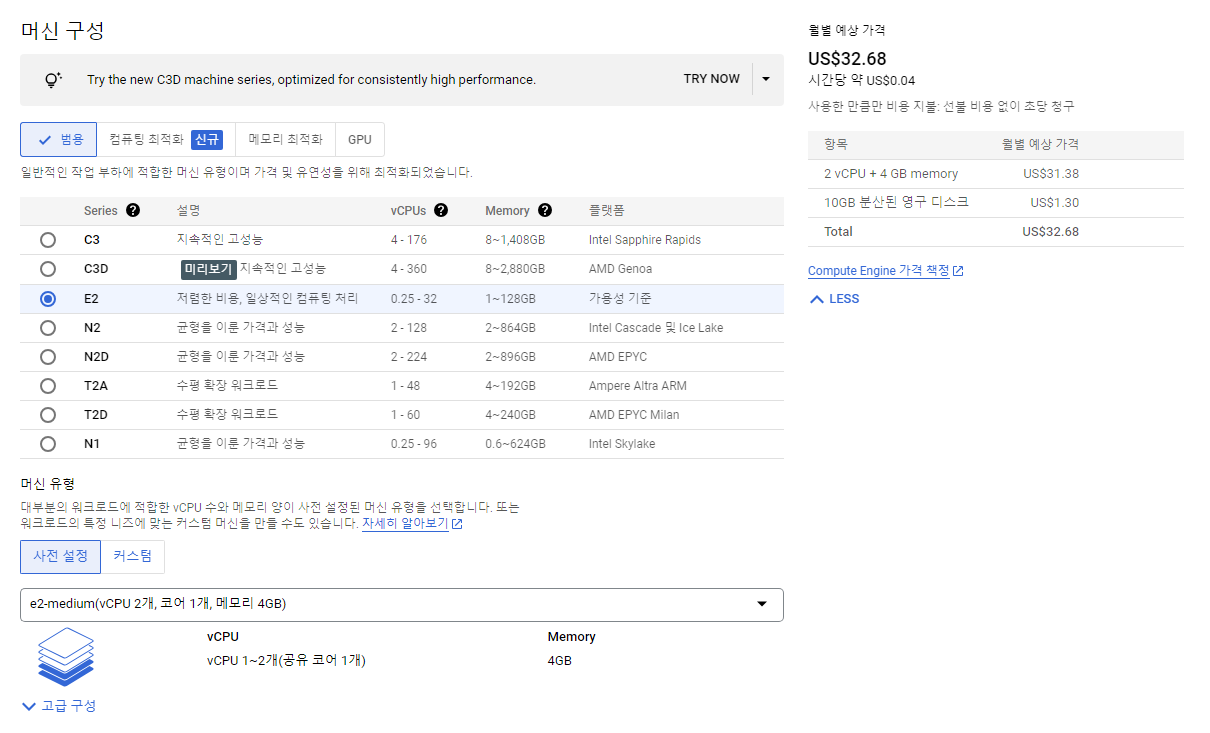 그리고 머신 유형에서 메모리 설정까지 해주면 옆에 월별 예상 가격이 뜰 것이다.