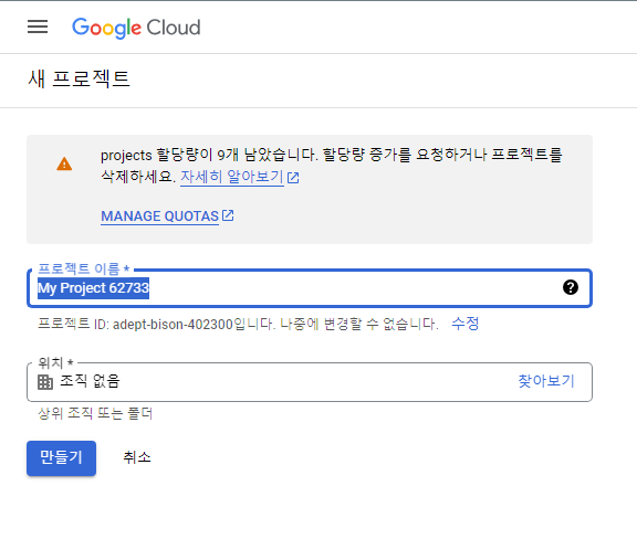 새 프로젝트를 생성했다면 아래와 같이 구글 클라우드 라고 적힌 부분에 프로젝트 명이 설정될 것이다.