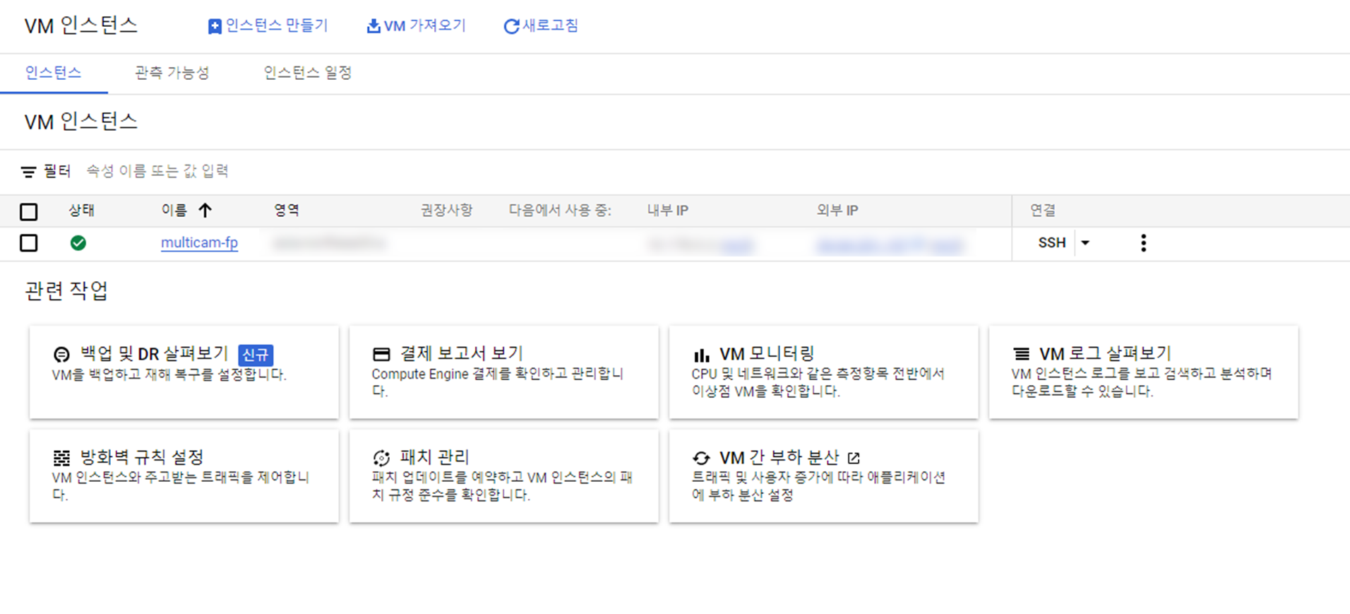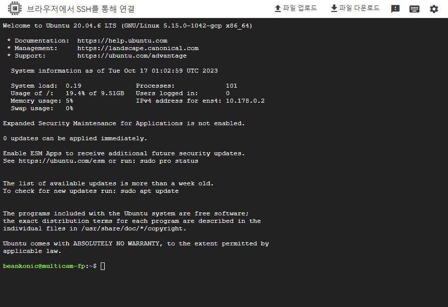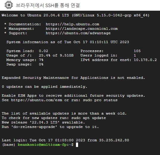 다시 VM 인스턴스 창으로 돌아와서 SSH 옆의 화살표를 눌러 브라우저 창에서 열기를 눌러준다.
