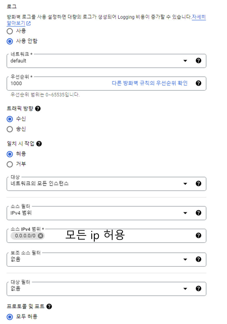 방화벽 규칙을 아래와 같이 세팅하는데, 소스 IPv4 범위를 아래와 같이 설정하는 이유는 모든 IP를 허용하기 위함이다.