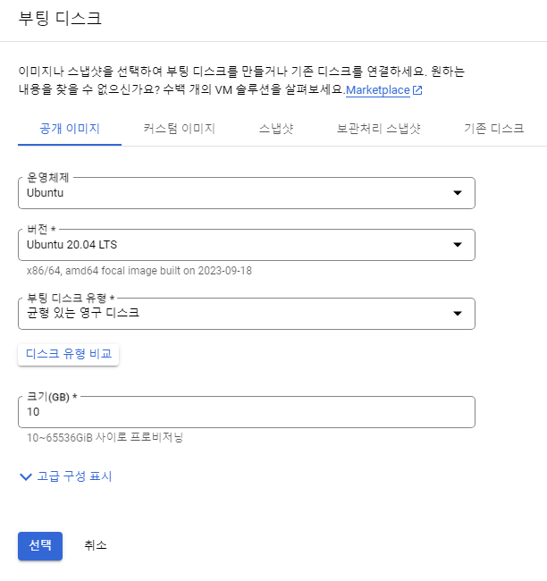 운영체제를 우분투로 변경한 후, 나머지는 기본 세팅값을 그대로 둔 상태로 생성했다.
