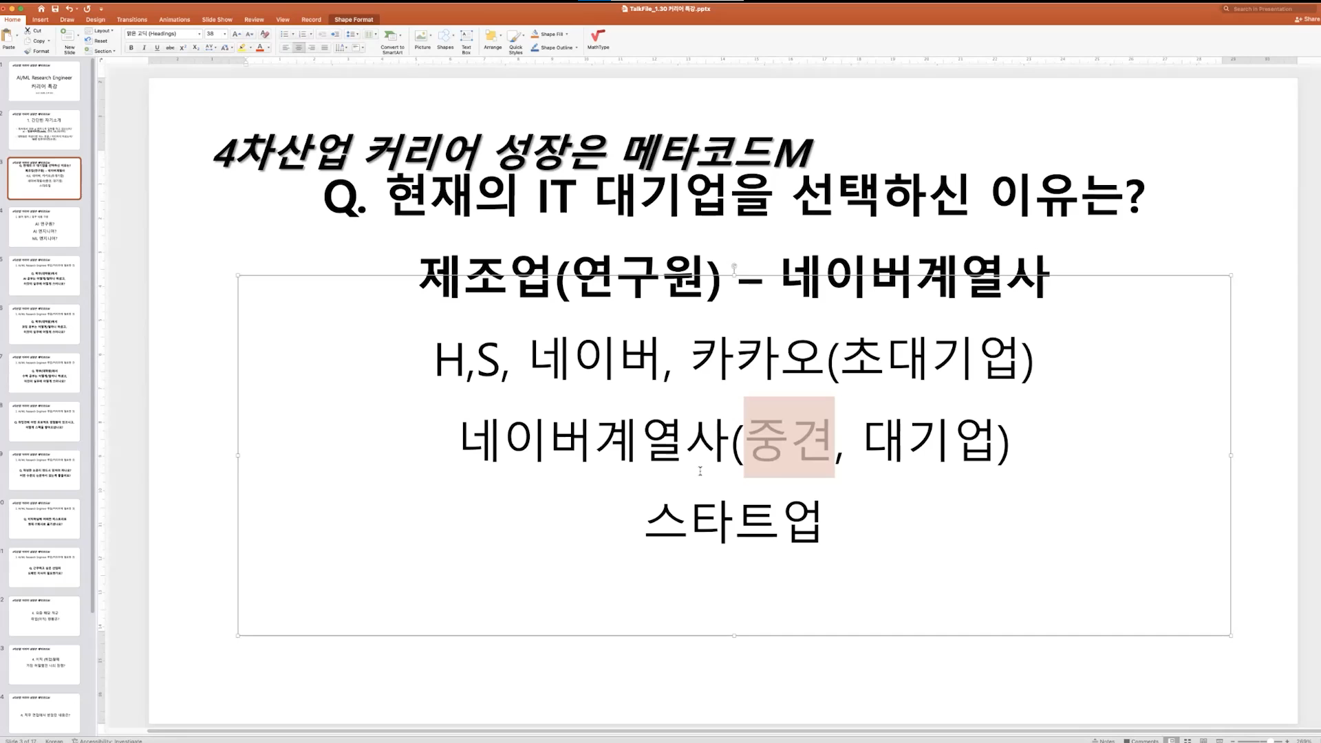 강사님이 나누신 것처럼 초대기업 / 중견~대기업 / 스타트업 이렇게 회사를 크게 3가지로 나누어 3가지 각각의 회사들을 직접 다니며 경험해보셨다고 한다.