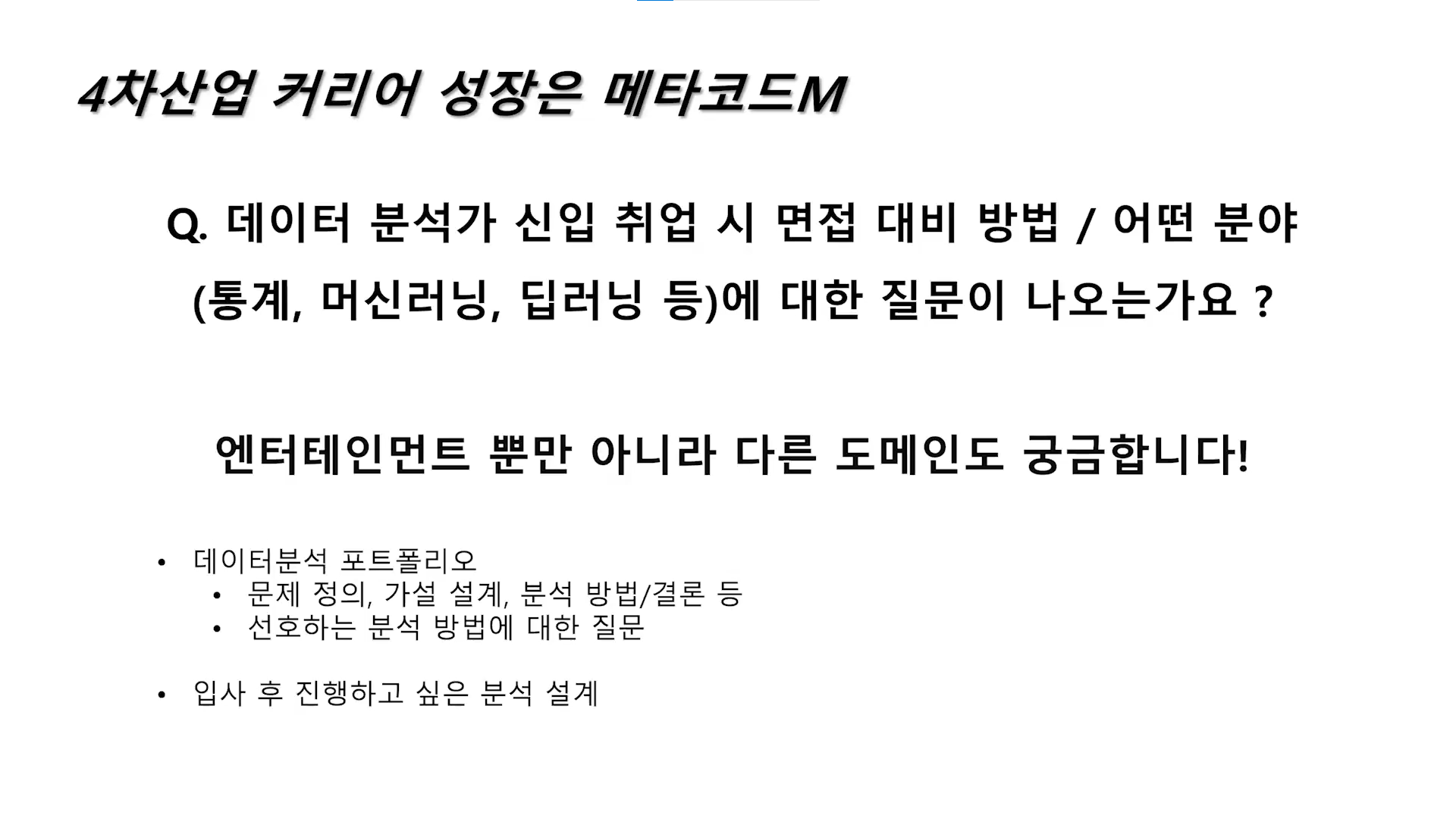 분석 경험이 여러개일 경우 본인이 선호하는 분석 방법이 어떤 것인지, 포트폴리오에 작성된 분석 방법을 회사에서 사용하는 방법과 겹치면 그런 것과 관련된 질문을 많이 한다고 했다.