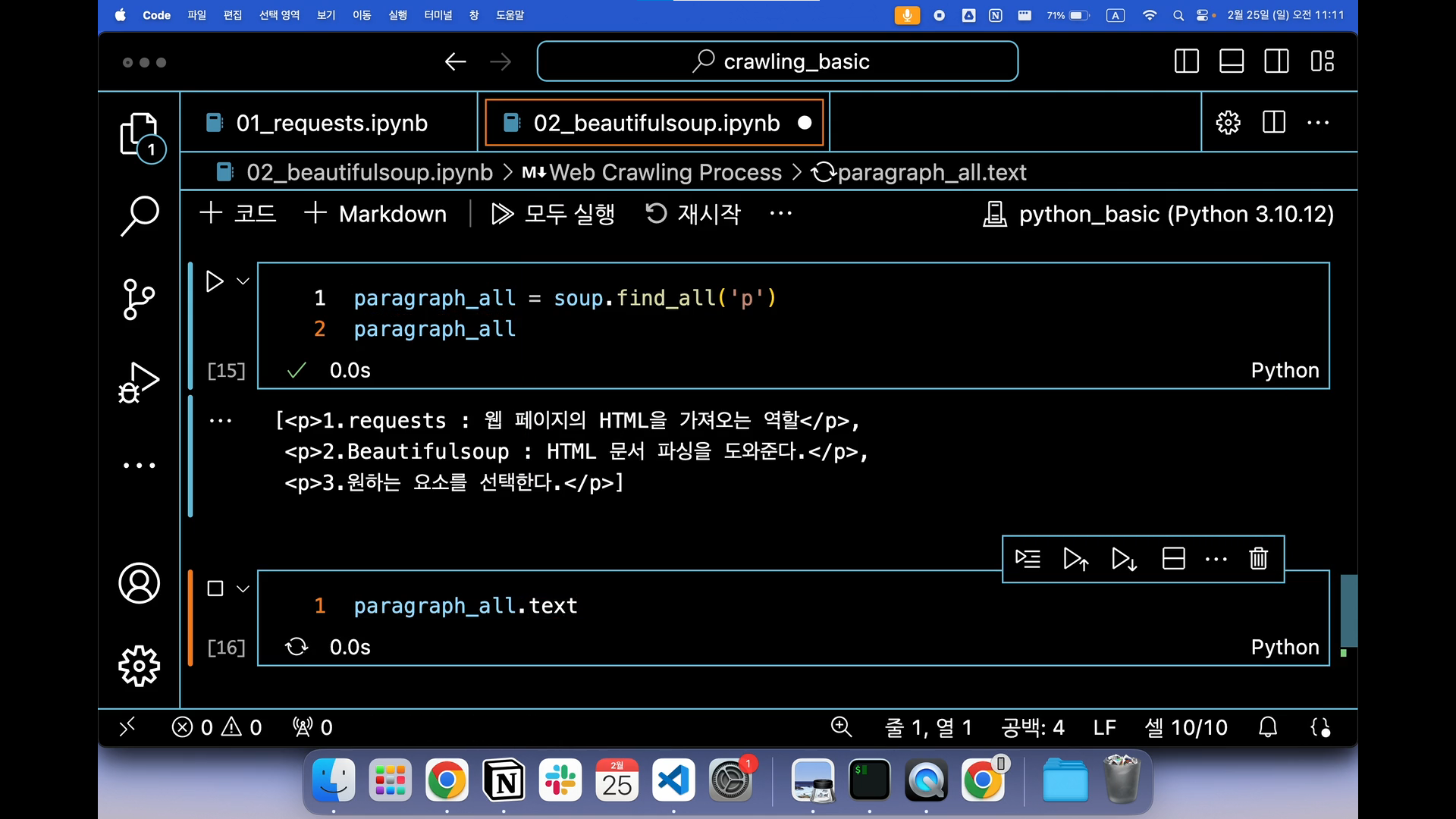크롤링에 대한 개념을 듣는 것만이 아닌, 실제 코드를 통해 어떻게 사용되는지에 대해서도 같이 실습해볼 수 있는 환경이라 이전에 크롤링 경험이 있지만, 야매로 코드를 찾아가며 진행했던 나에겐 기본기를 다질 수 있는 시간이 된 것 같아 좋았다.