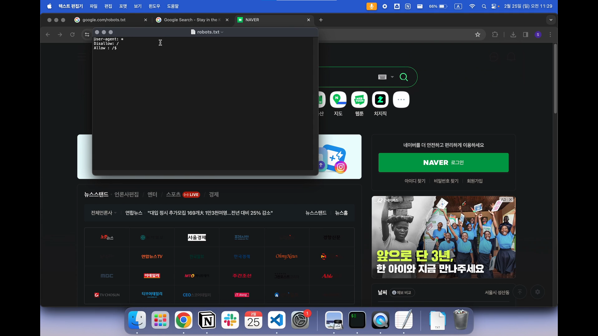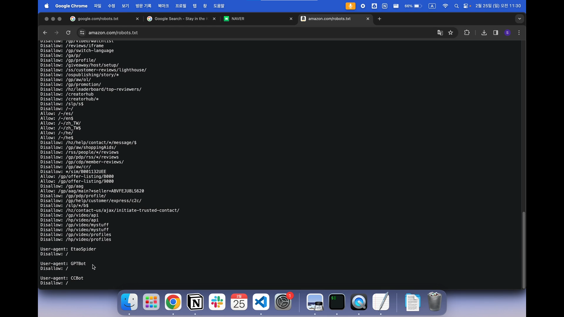 네이버는 모든 유저에게 전체 문서에 대한 접근을 허용하지 않고 있다는 뜻이며, $ 표시로 끝나는 페이지만 허용을 해주고 있다.