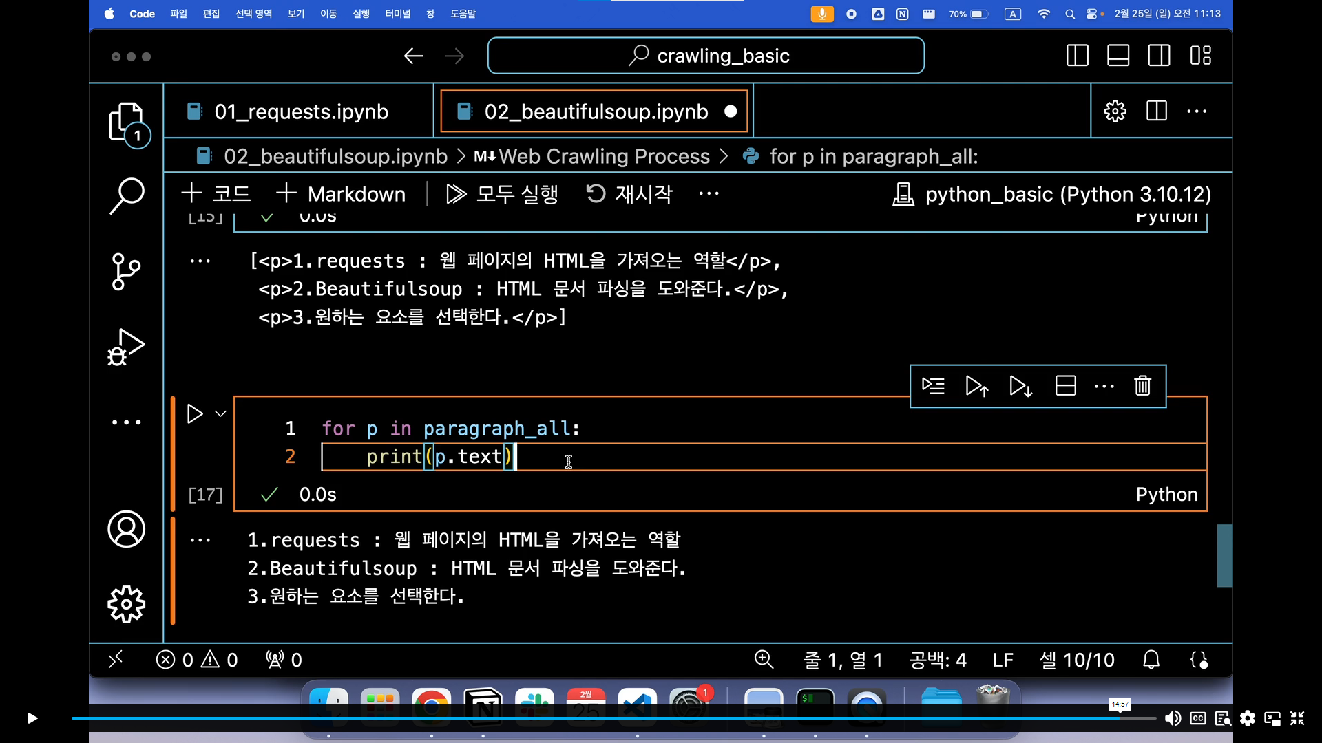 크롤링에 대한 개념을 듣는 것만이 아닌, 실제 코드를 통해 어떻게 사용되는지에 대해서도 같이 실습해볼 수 있는 환경이라 이전에 크롤링 경험이 있지만, 야매로 코드를 찾아가며 진행했던 나에겐 기본기를 다질 수 있는 시간이 된 것 같아 좋았다.