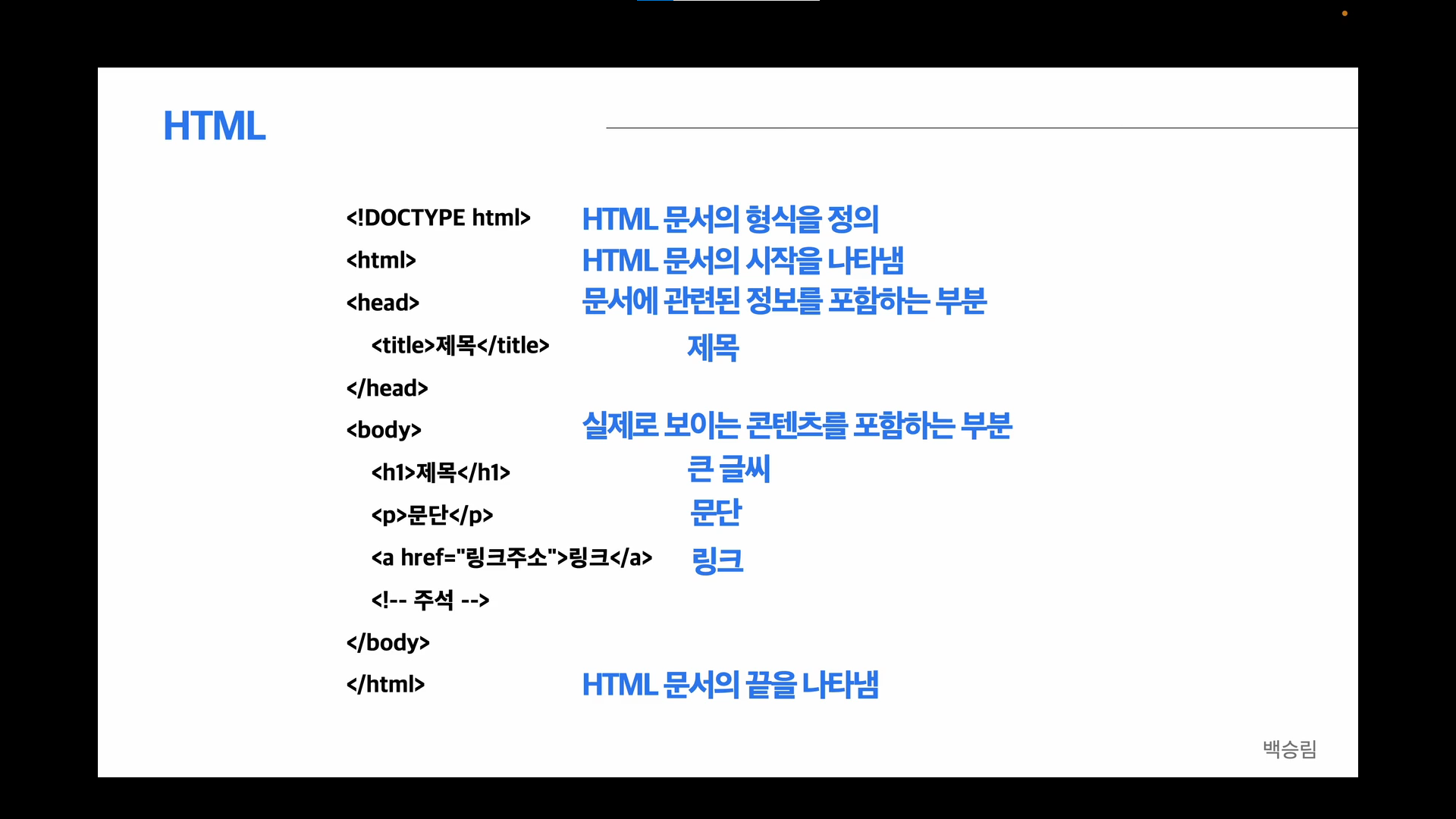 주석의 경우 <!--주석-->으로 표현을 하고 있으며, 링크같은 것을 표현할 때는 a 태그를 사용한다.