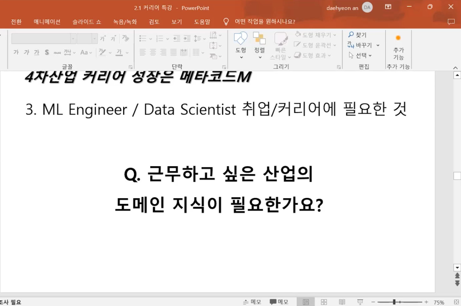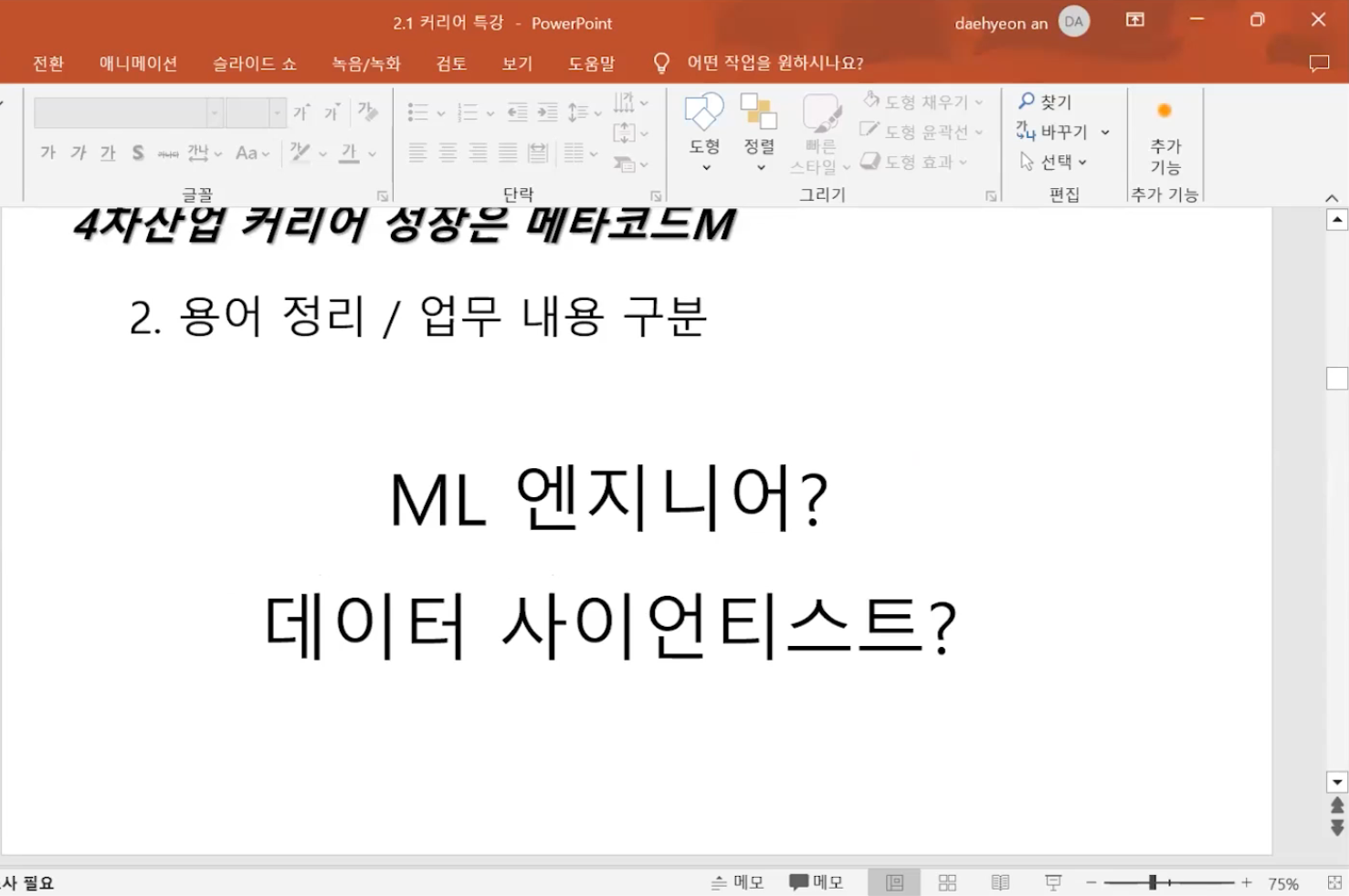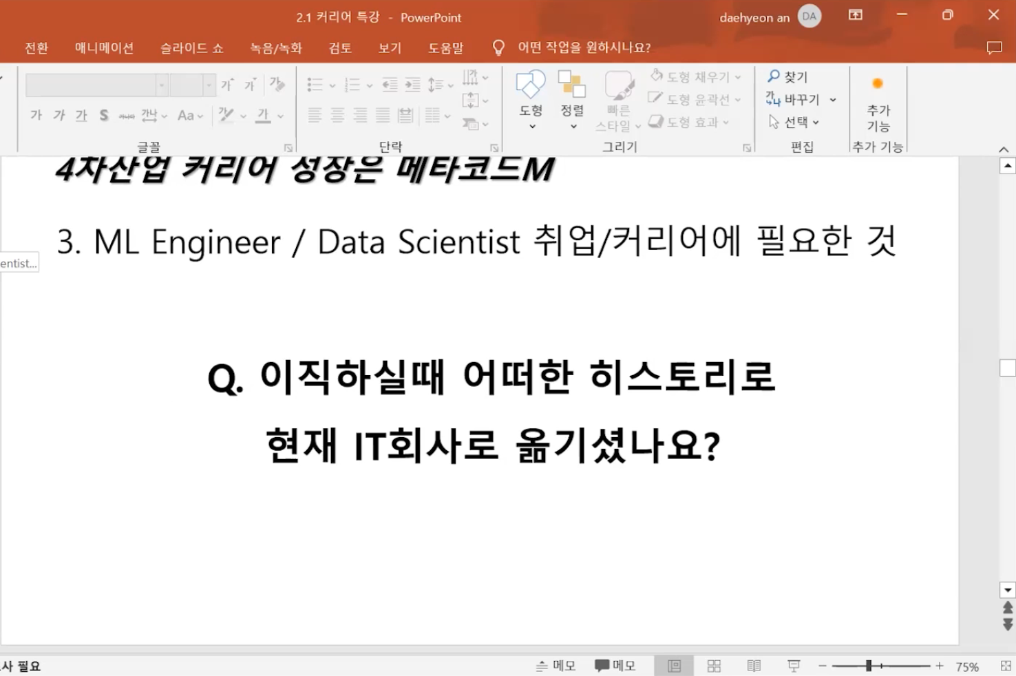 데이터 분석가 인데도 데이터 사이언티스트의 업무까지 모두 담당하는 곳도 있었다고 하셨다.