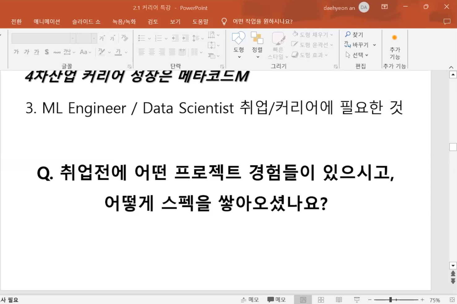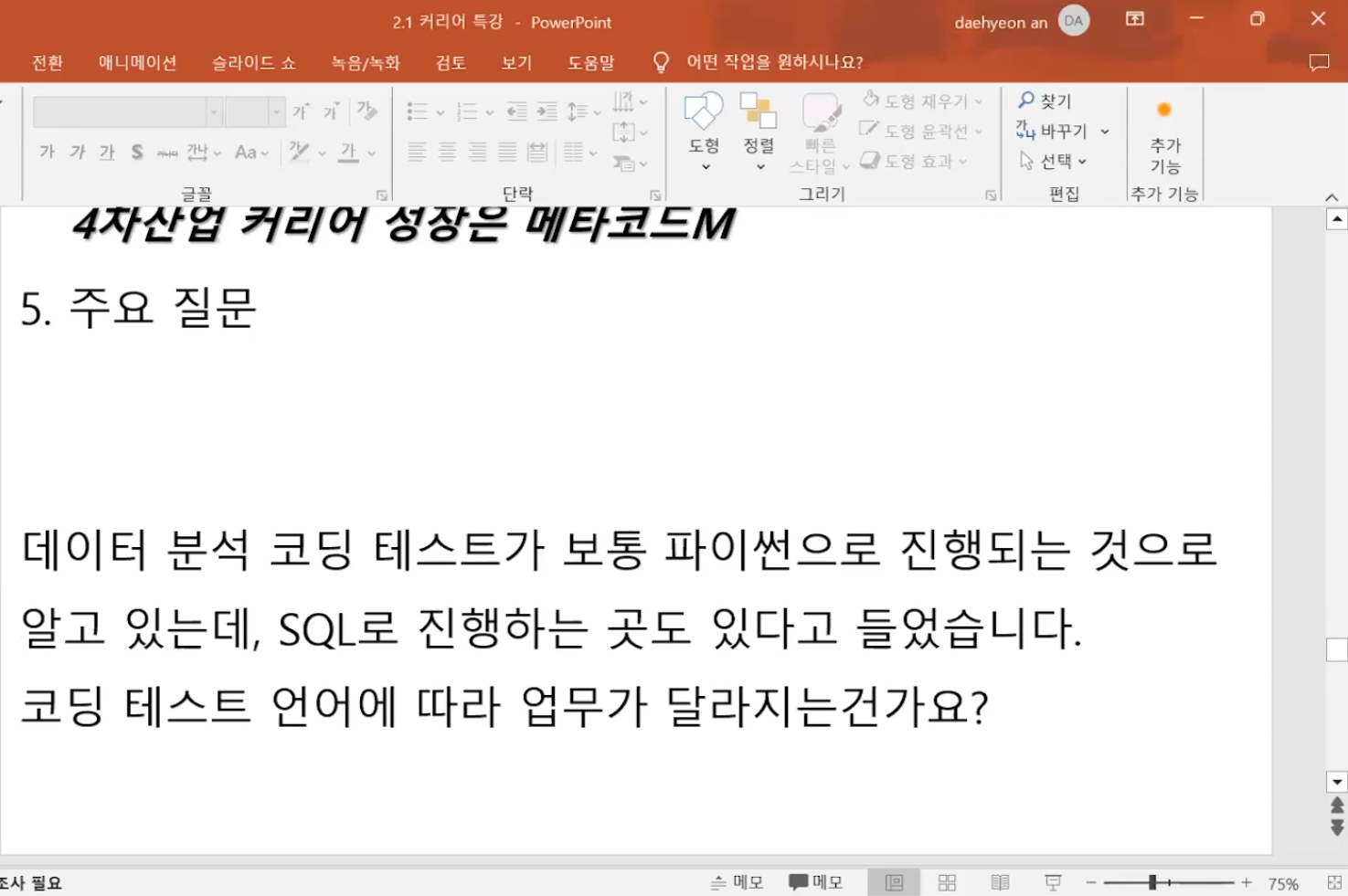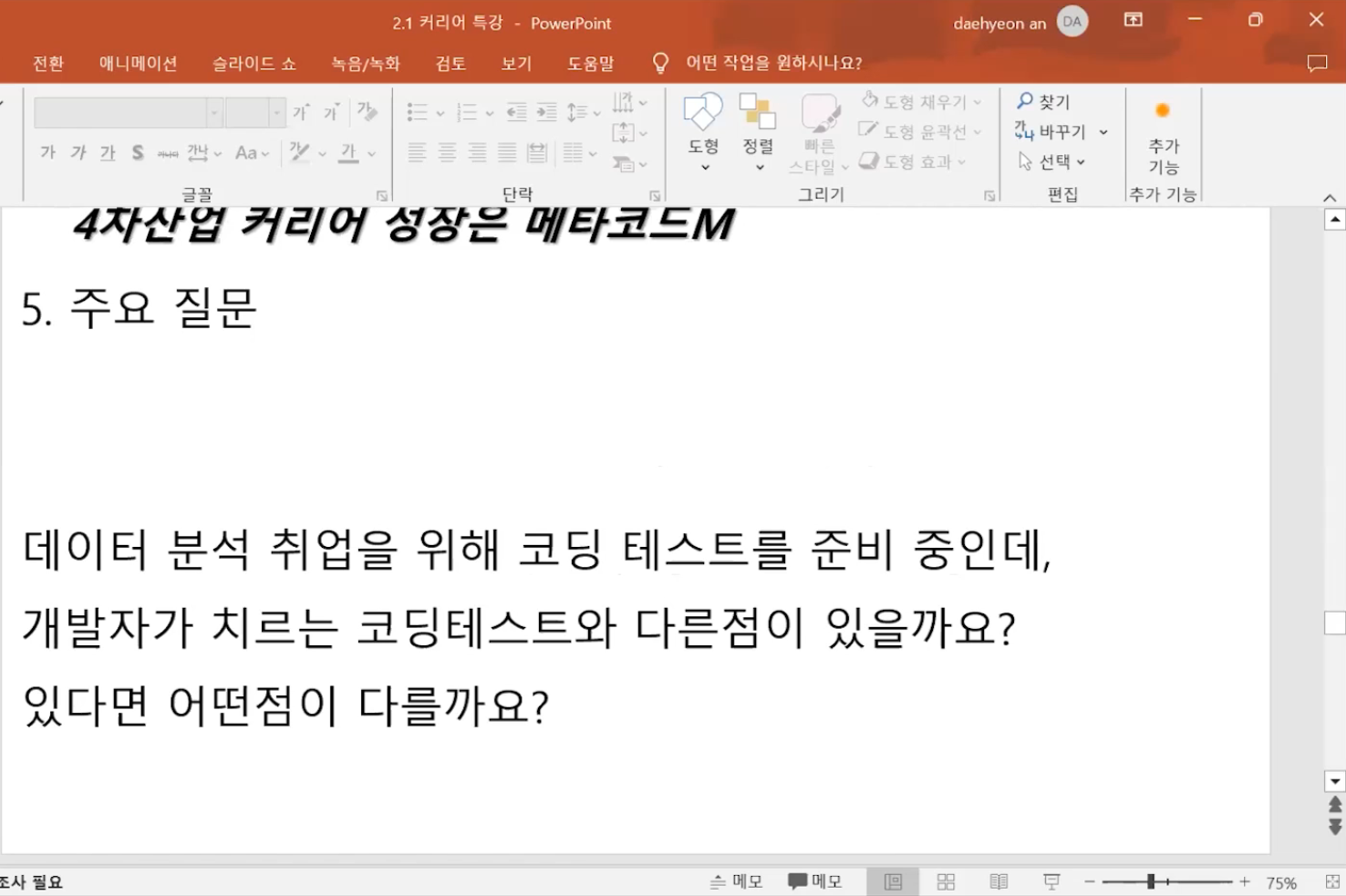이 질문은 이전에 다른 취업 특강에서도 있었던 질문이었는데 또 사전 질문으로 들어온 것 같았다.