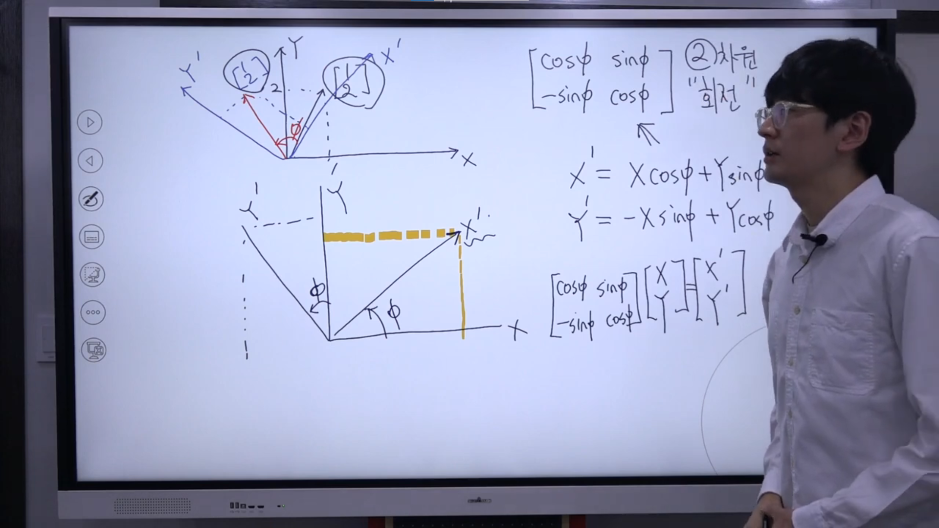 2차원 행렬의 회전에 대해 더 알아보는 시간을 가지면, [1 2] 라는 벡터가 있을 때, 같은 길이의 X'과 Y'을 기준으로 회전에 적용해보자면,