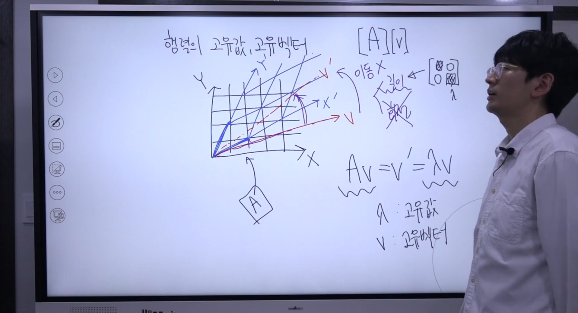 여기서 벡터가 회전을 하지 않고 길이와 방향만 바뀌는 특정 벡터를 고유벡터라고 하며,