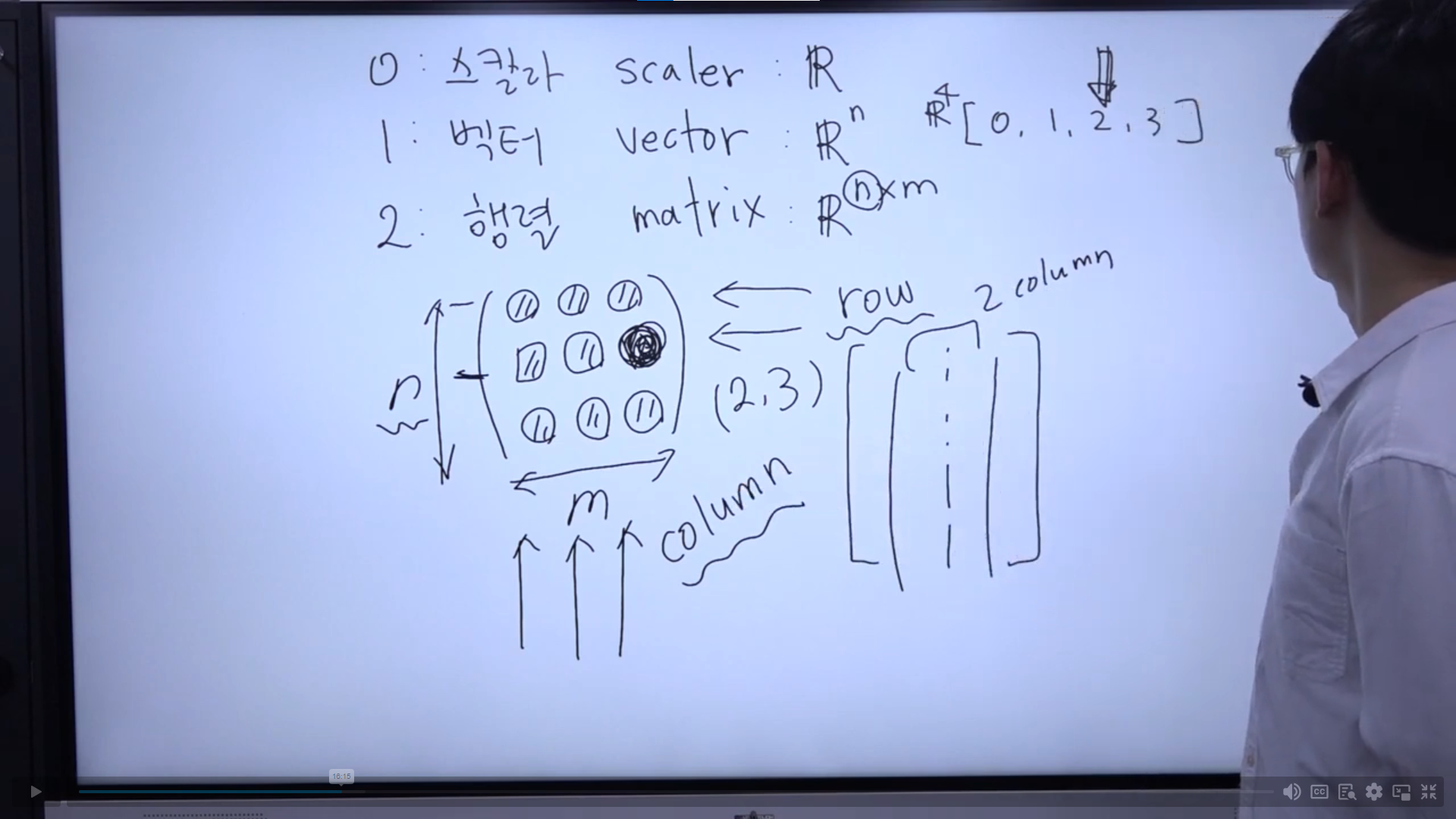 그리고 간단하게 행렬에 대해 설명해주셨는데, 행렬은 2차원 배열에서 세로 X 가로 형식으로 나타내며 벡터의 나열이라고 설명해주셨다.