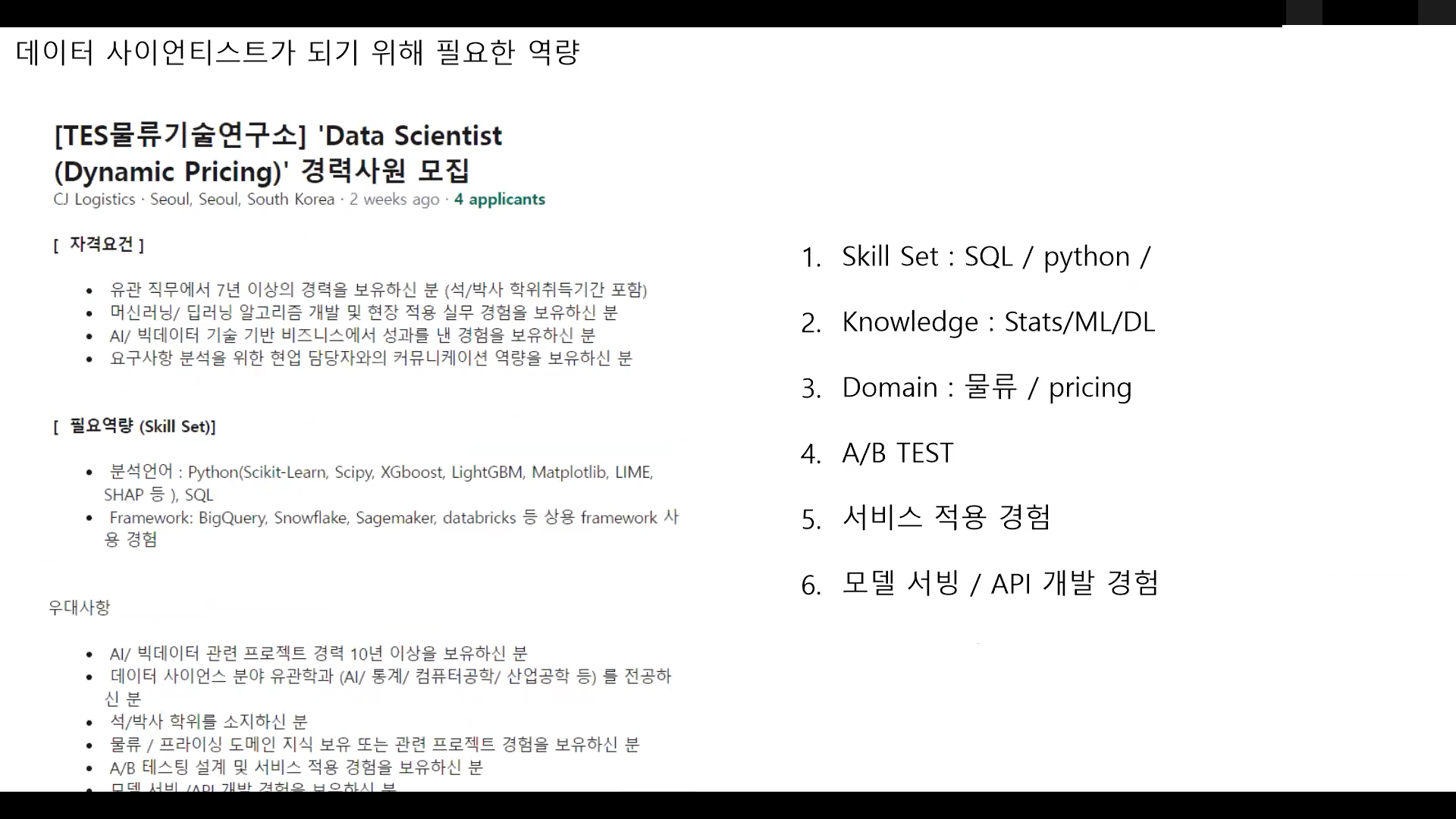 이커머스 산업 경험자라는 도메인과 SQL, 파이썬 등의 스킬을 요구하고 있다.