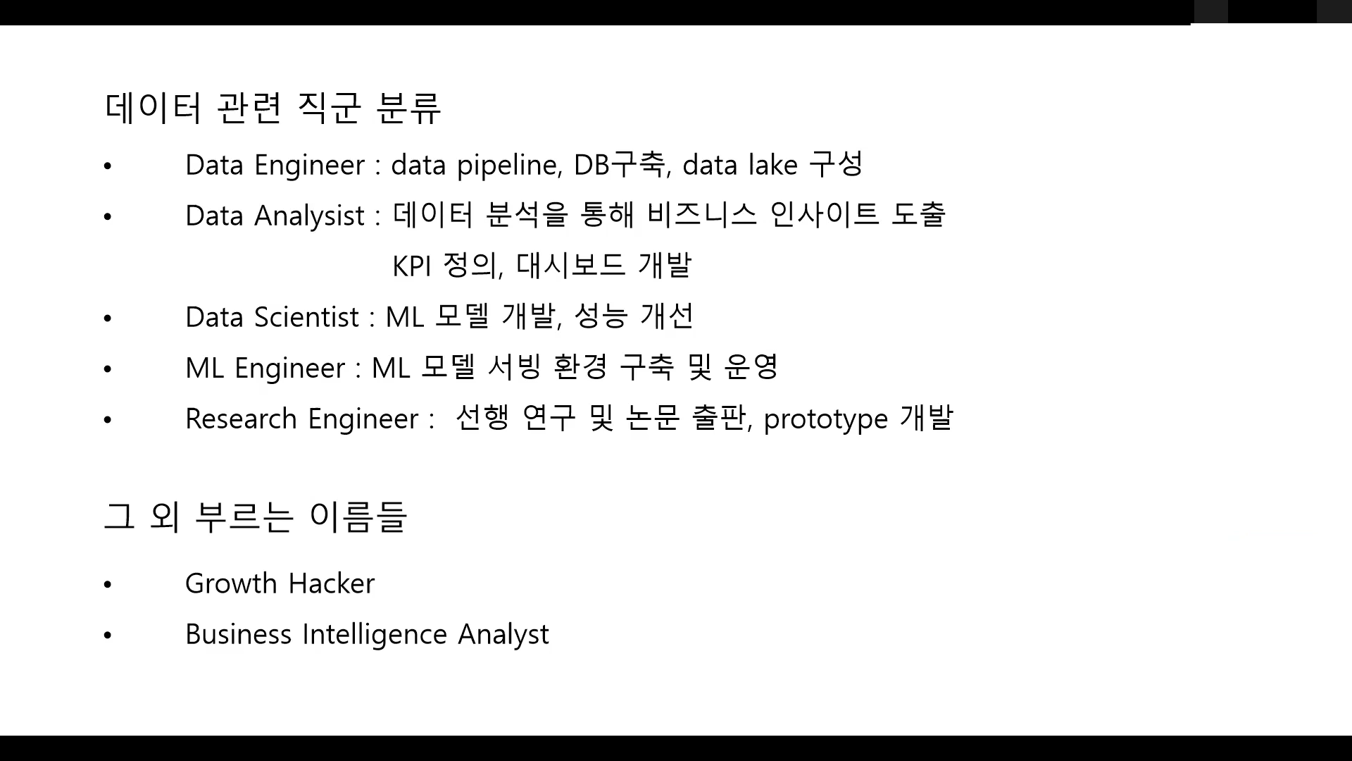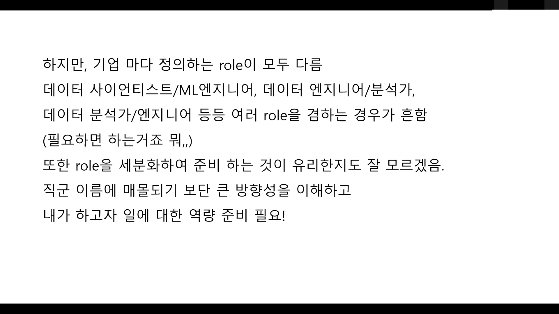 기업마다 뽑는 포지션과 요구되는 역할이 다르기때문에 일반적으로 데이터 분석가나 데이터 사이언티스트 등의 직무를 따져서 내가 할일은 KPI 지표를 확립하는게 아니다 라고 생각하지 말고 기업이 해당 직무에 요구하는 스킬과 역량을 파악하고 그대로 해나가려는 준비를 하는 것이 바람직하다고 한다.