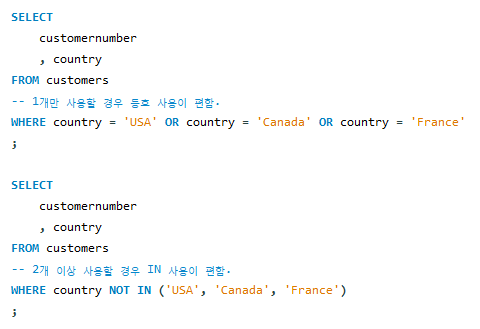보통 WHERE과 같이 묶어서 사용하며, 원하는 컬럼을 여러개 뽑을 때 간결하게 표현할 수 있다.