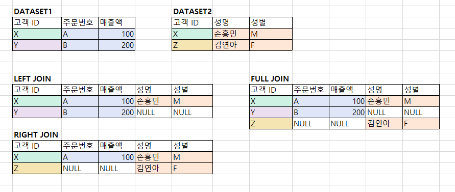 이 때, 두 데이터에서 가지고 있는 값들이 달라 없는 부분의 경우에는 NULL 로 표시한다.