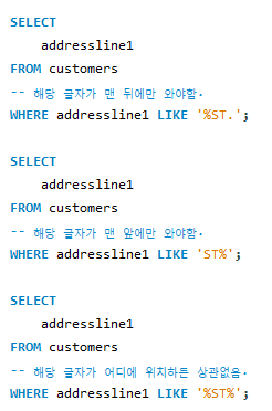 위처럼 %의 위치에 따라 찾고자 하는 글자가 어느 부분에 위치해야하는지가 다르다.