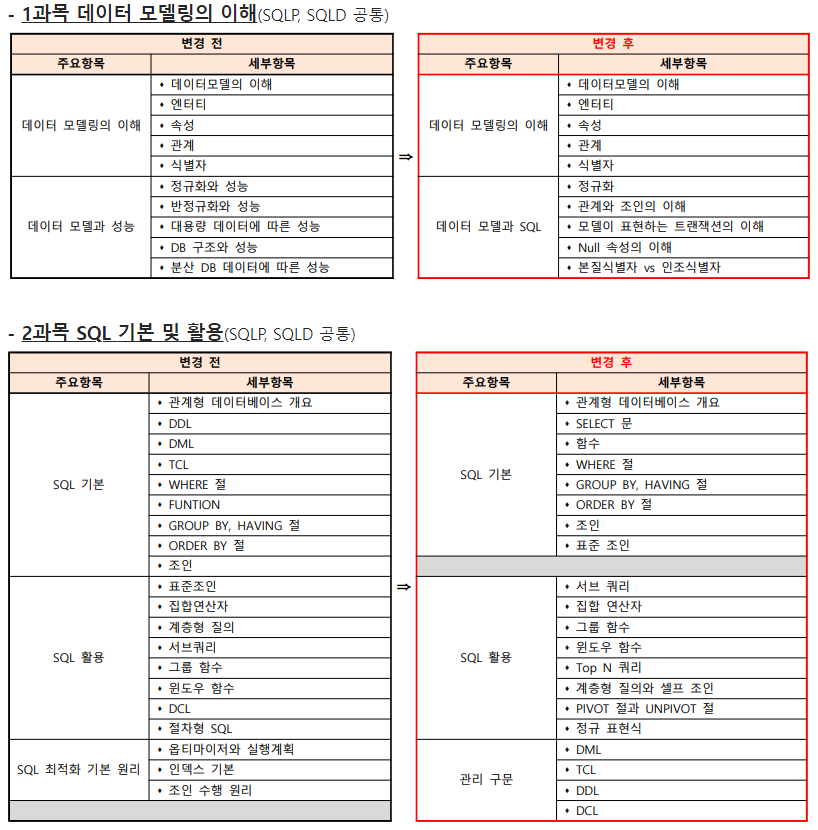 먼저 개편된 sqld에 대해서는 데이터 자격검정 사이트 공지사항에서 확인할 수 있으며, 공지사항의 일부를 캡쳐해왔다.