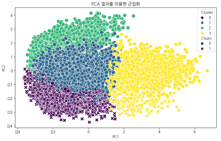 matplotlib 으로 나눔고딕 폰트만 입히면 꼭 마이너스 부분을 인식하지 못하는 에러가 생기는 것 같다.(이 부분은 프로젝트가 끝난 후에 따로 찾아보고 포스팅을 작성해보겠다.)군집분석을 시각화하기 위해 주성분분석을 활용했다.