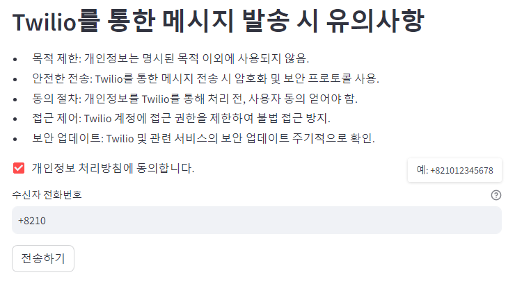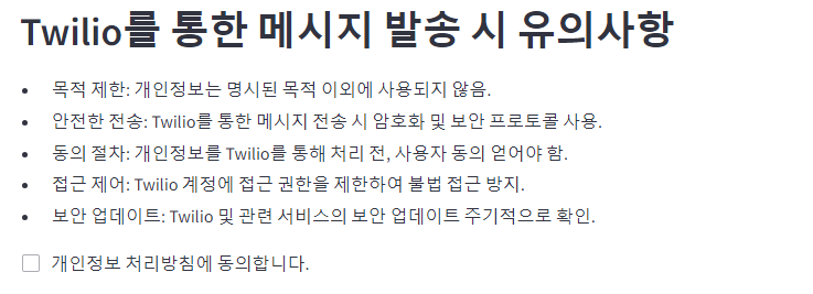 - 동의 절차: 개인정보를 Twilio를 통해 처리 전, 사용자 동의 얻어야 함.